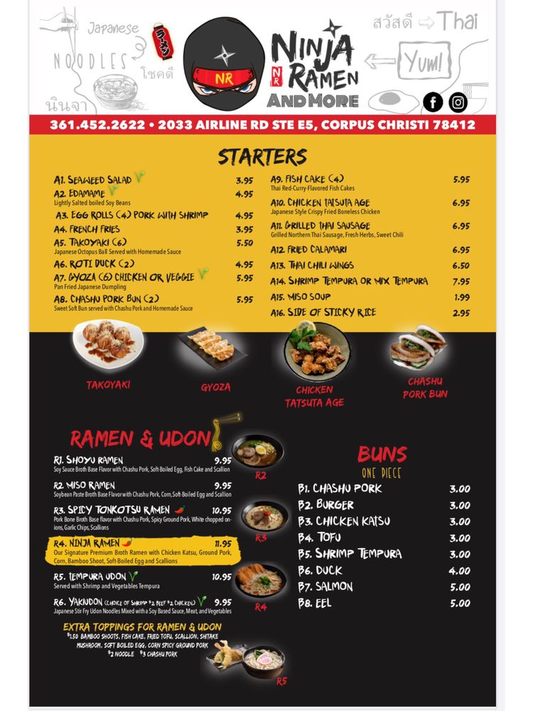 Ninja Ramen and Thai, located in Corpus Christi, TX, offers a unique fusion of Thai and Ramen cuisine. With a variety of starters like Seaweed Salad and Takoyaki, as well as delicious Ramen options like Shoyu, Miso, and Spicy Tonkotsu, this restaurant is a must-visit for food enthusiasts. The menu also includes mouth-watering buns like Chashu Pork and Chicken Katsu. Ninja Ramen and Thai caters to diverse dietary preferences with vegan and vegetarian options. The cozy atmosphere and friendly service make dining here a delightful experience, perfect for indulging in a flavorful culinary adventure.